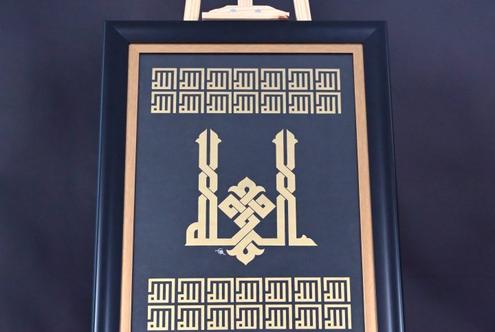 الله” بأسلوب الخط الكوفي القديم، الذي يُعرف بجماله الهندسي وتاريخه العريق. منفذ على ورق مصقول فاخر، ومزخرف بزينة تقليدية كلاسيكية ولمسات من الذهب. قطعة تضيف إلى المكان مظهرًا مميزًا.