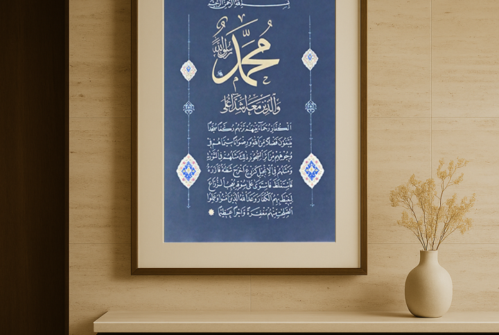Set against a deep jet-black paper, the verse is written with rich pigment colors, creating a striking contrast that radiates spiritual depth and visual strength. A bold statement piece that blends ancient geometry with profound meaning — ideal for modern or traditional spaces alike.