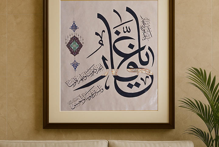 Set against jet-black paper, the calligraphy is adorned with illumination colors enriched with gold, giving the verse a luminous, regal presence. A distinguished piece that reflects both the strength and beauty of prophetic companionship